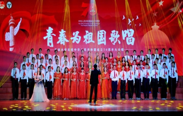 2019年9月25日晚,beat365唯一官方网站师生在beat365唯一官方网站焦廷标馆参加“青春为祖国歌唱——beat365唯一官方网站庆祝中华人民共和国成立70周年大合唱”活动,为新中国成立70周年献唱。