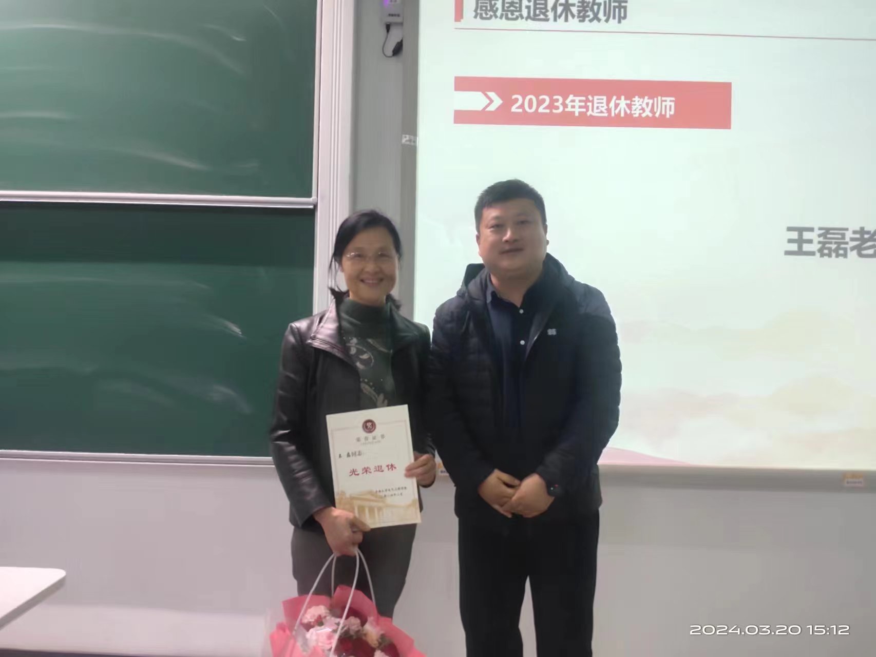 首先,举行教职工荣休仪式。2023年,王磊老师光荣退休,副院长(主持工作)花为为王磊老师颁发荣休证书并献花。王磊老师在仪式上发言,她回顾了自己从求学到来东大工作的经历,感谢前辈们和其他同事对其成长过程中的帮助,感谢东大和电气学院对其培养,对学院各项事业的快速发展感到欣慰,并表示退休后将继续关注学院的发展,做些力所能及的事。
