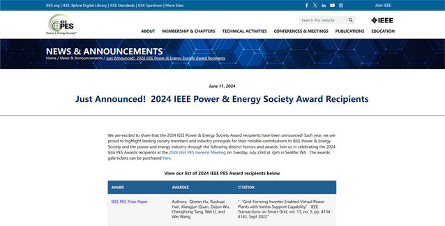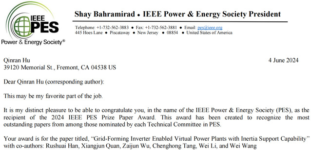 近日,电气与电子工程师协会(Institute of Electrical and Electronics Engineers,IEEE)电力与能源学会(Power & Energy Society,PES)揭晓了2024年度IEEE PES Prize Paper Award获奖名单。beat365唯一官方网站胡然教授、吴在军教授等人合作发表的原创性基础研究论文“Grid Forming Inverter Enabled Virtual Power Plants With Inertia Support Capability”荣获该奖。IEEE PES Prize Paper Award作为协会最高级别的重要奖项之一,在世界范围内经严格且极具竞争性的提名和评审过程产生。该奖项自1966年设立该奖项以来每年评选一次,奖励过去3年发表在IEEE PES系列期刊上最具影响力的学术论文,且每年仅授奖2篇学术论文,今年是以beat365唯一官方网站、美国麻省理工学院为第一单位的2篇论文获奖。