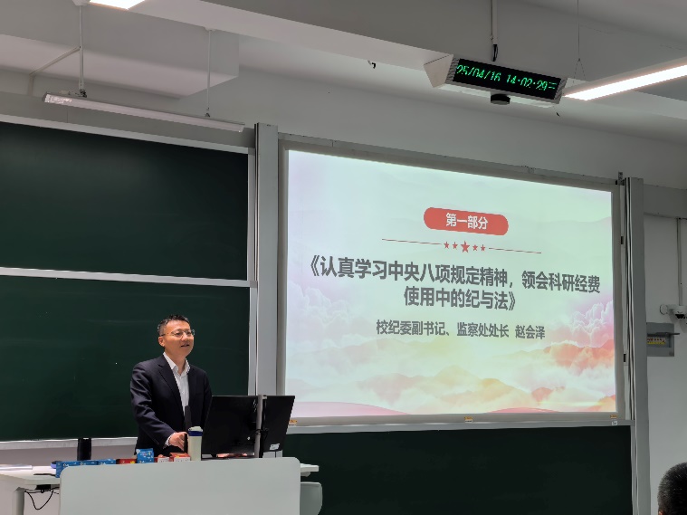 会议特别邀请校纪委副书记、监察处处长赵会泽作题为《认真学习中央八项规定精神,领会科研经费使用中的纪与法》的报告。报告中,赵会泽对学校纪检监察机构的情况进行了简要介绍,阐述了教职员工与纪检监察机构之间的关联和交集,希望能与大家同向同行,共同营造风清气正政治生态。随后,梳理总结了中央八项规定及其实施细则的主要内容和精神实质,并结合教师在科研经费管理使用领域的常见误区和现实案例,进行深度剖析,以案释纪、以案释法。