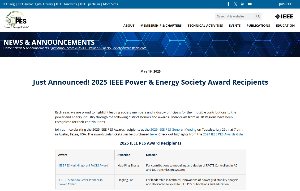 范玲玲教授荣获电力先锋奖(IEEE PES Wanda Reder Pioneer in Power Award),奖励委员会的颁奖词是表彰其“在电网稳定性分析技术创新方面的卓越领导力,以及对IEEE PES出版物与教育事业的杰出贡献”(For leadership in technical innovations of power grid stability analysis and dedicated services to IEEE PES publications and education)。