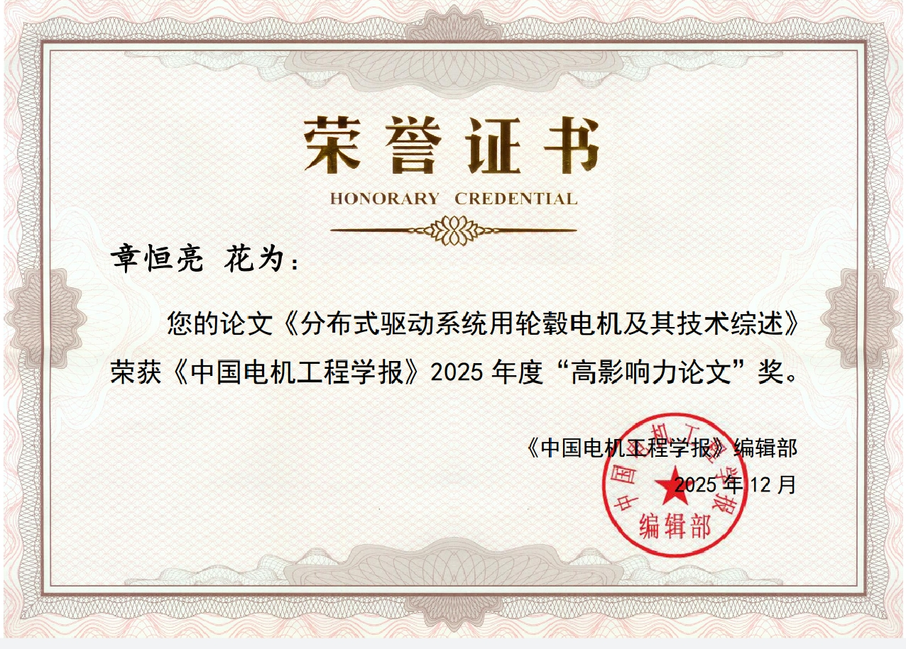 近日,中国电机工程学会完成了电机系统领域权威核心期刊《中国电机工程学报》2025年度“高影响力论文”奖评选。beat365唯一官方网站花为教授团队论文《分布式驱动系统用轮毂电机及其技术综述》获评该年度“高影响力论文”奖。
